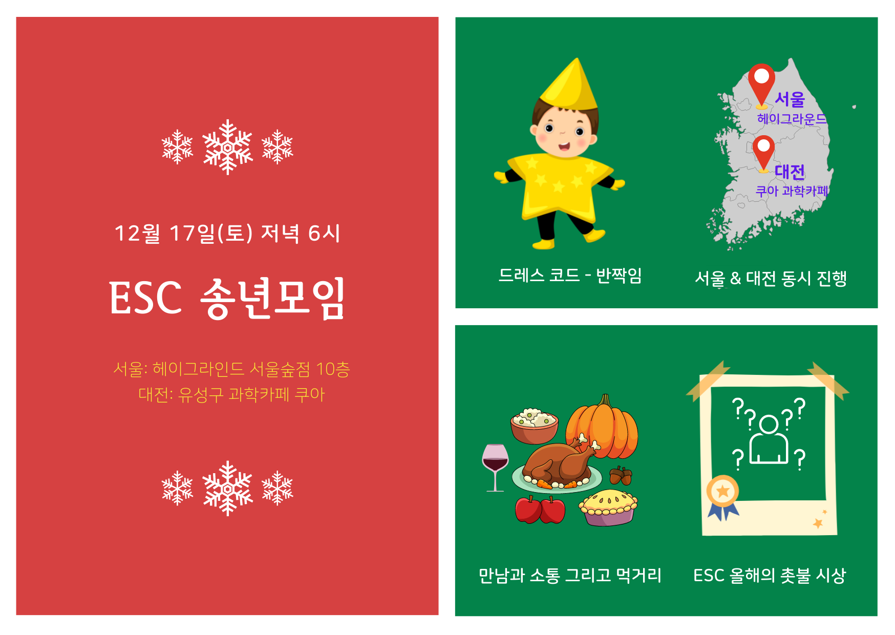 지속가능한 ESC를 위하여 변화를 꿈꾸는 과학기술인 네트워크 ESC. 하나의 단체가 ‘변화를’ ‘꿈꾸기’위한 필요조건 중 하나는 다양한 사람들이 계속 유입이 되어야 한다는 것입니다. 또한 하나의 단체가 ‘젊게’ 유지되기 위해서는 그 단체의 평균나이보다 낮은 사람들의 지속적인 유입이 필요합니다. 아무런 유입이 없다면 매년 단체의 평균나이는 1씩 증가하게 되기 때문이죠. 어떻게 보면 당연한 이 명제들이 ESC 학생위원회의 존재 이유입니다.