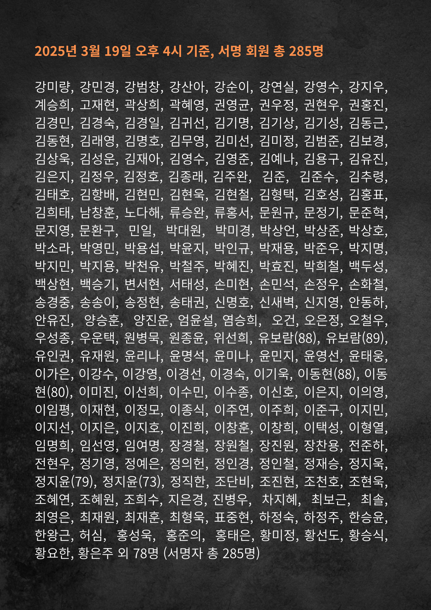 ⚠️ 서명 추가자: 황혁기, 정동원, 맹미선 외 3명 (2025년 3월 20일 기준 총 291명) ⚠️ 서명 참여는 헌재 선고일 공고 자정까지 받습니다. (참여하기) |