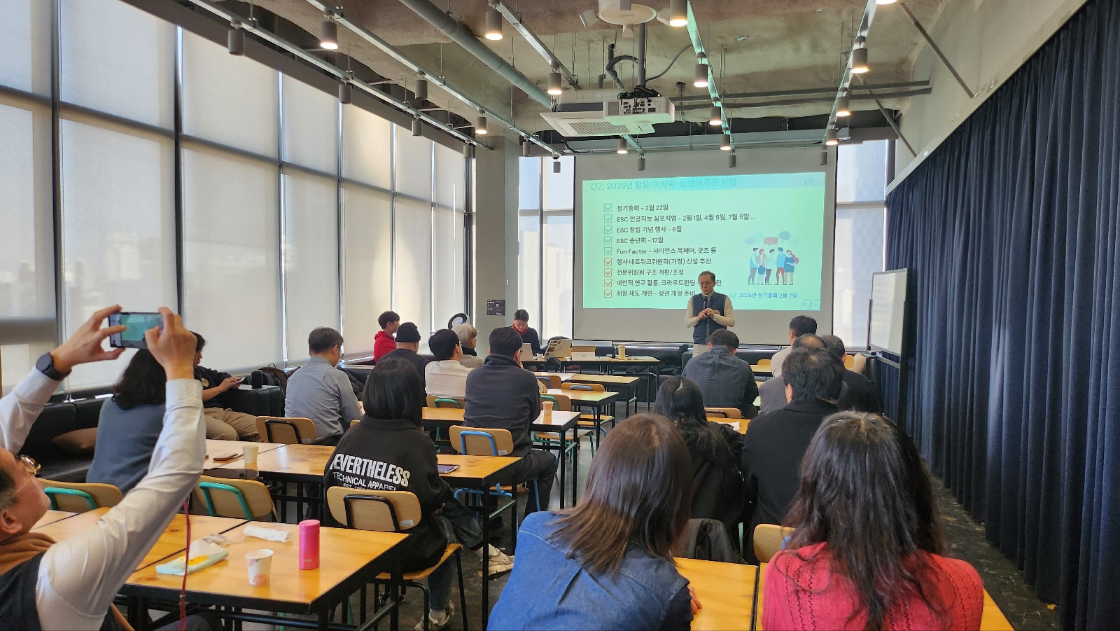 2월 22일(토), 헤이그라운드 서울숲점에서 2025 ESC 정기총회가 열렸어요. 총 145명의 책임회원이 참석(현장 24명, 위임 121명)하여 개의정족수를 충족했고, 의장이 개회를 선언했어요.