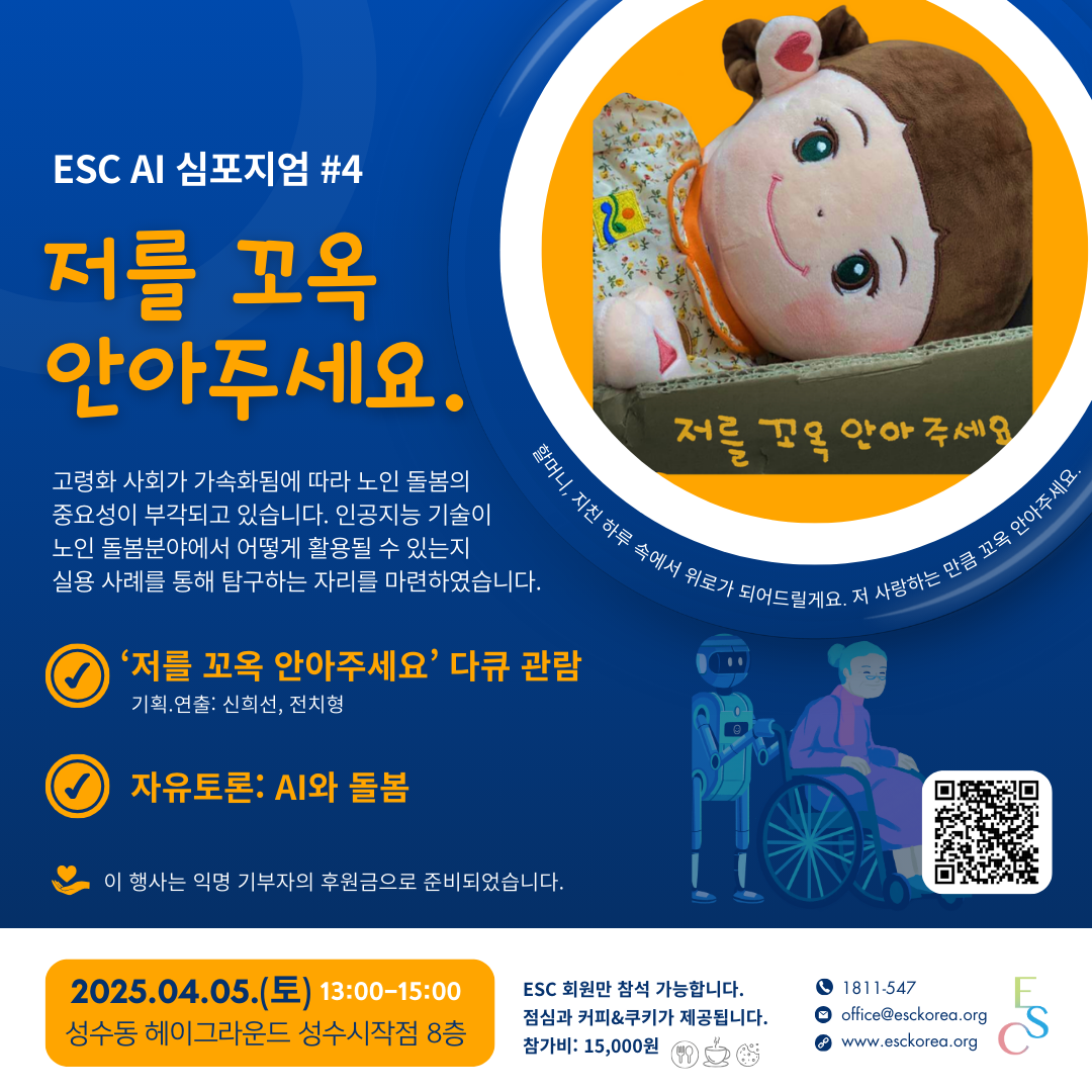 오는 4월 5일 토요일, ESC 인공지능 심포지엄이 ‘노인 돌봄과 AI’를 주제로 열려요.
