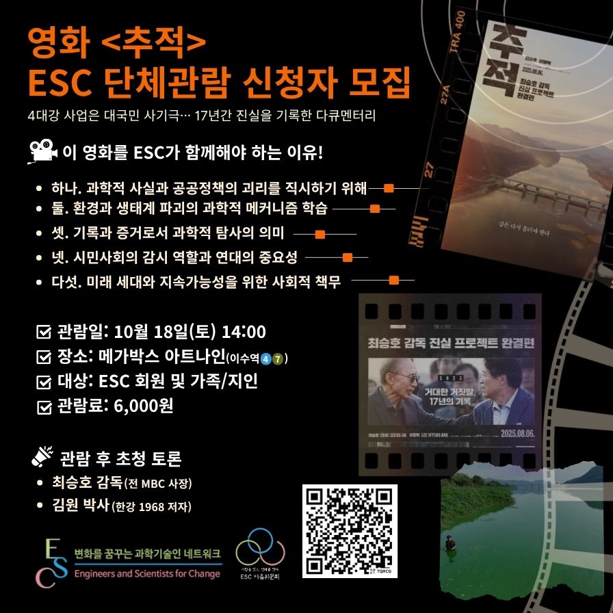 ESC 이음위원회에서는 영화 <추적> 단체관람을 통해 4대강 사업이 드러낸 과학과 정책의 괴리를 성찰하고자 합니다. 또한 환경과 생태계 파괴의 메커니즘을 과학적 시선으로 짚어보며, 17년에 걸친 기록 속에서 진실을 추적한 과정을 통해 시민사회의 감시와 연대의 가치를 되새기려 합니다. 나아가 미래 세대를 위한 책임과 실천을 ESC 회원들과 함께 나누고자 합니다.