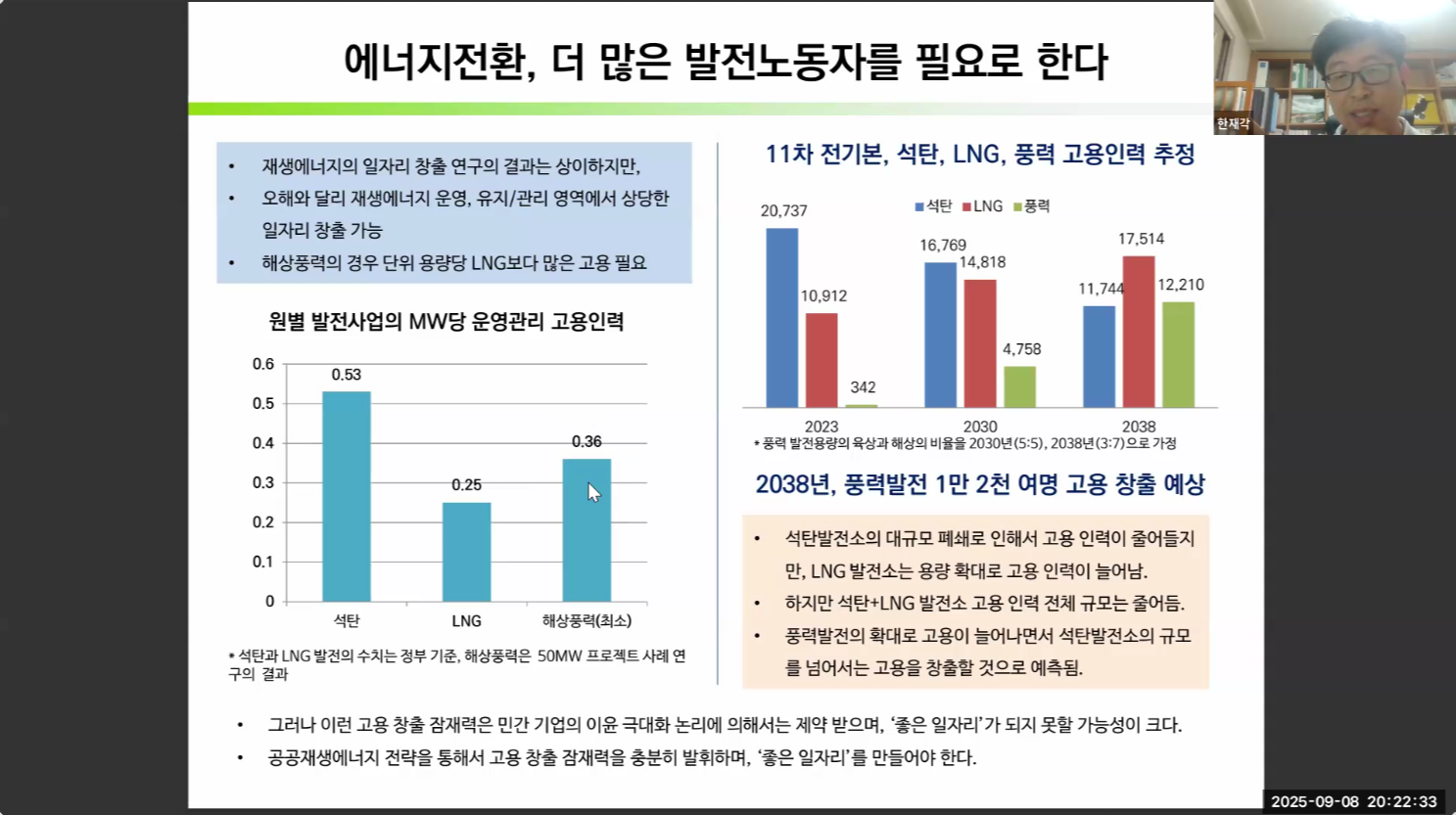 토론에서는 에너지 전환을 단순한 기술이 아닌 일자리·복지·공공성·순환경제가 맞물린 사회적 전환으로 바라봐야 한다는 데 뜻을 모았습니다.