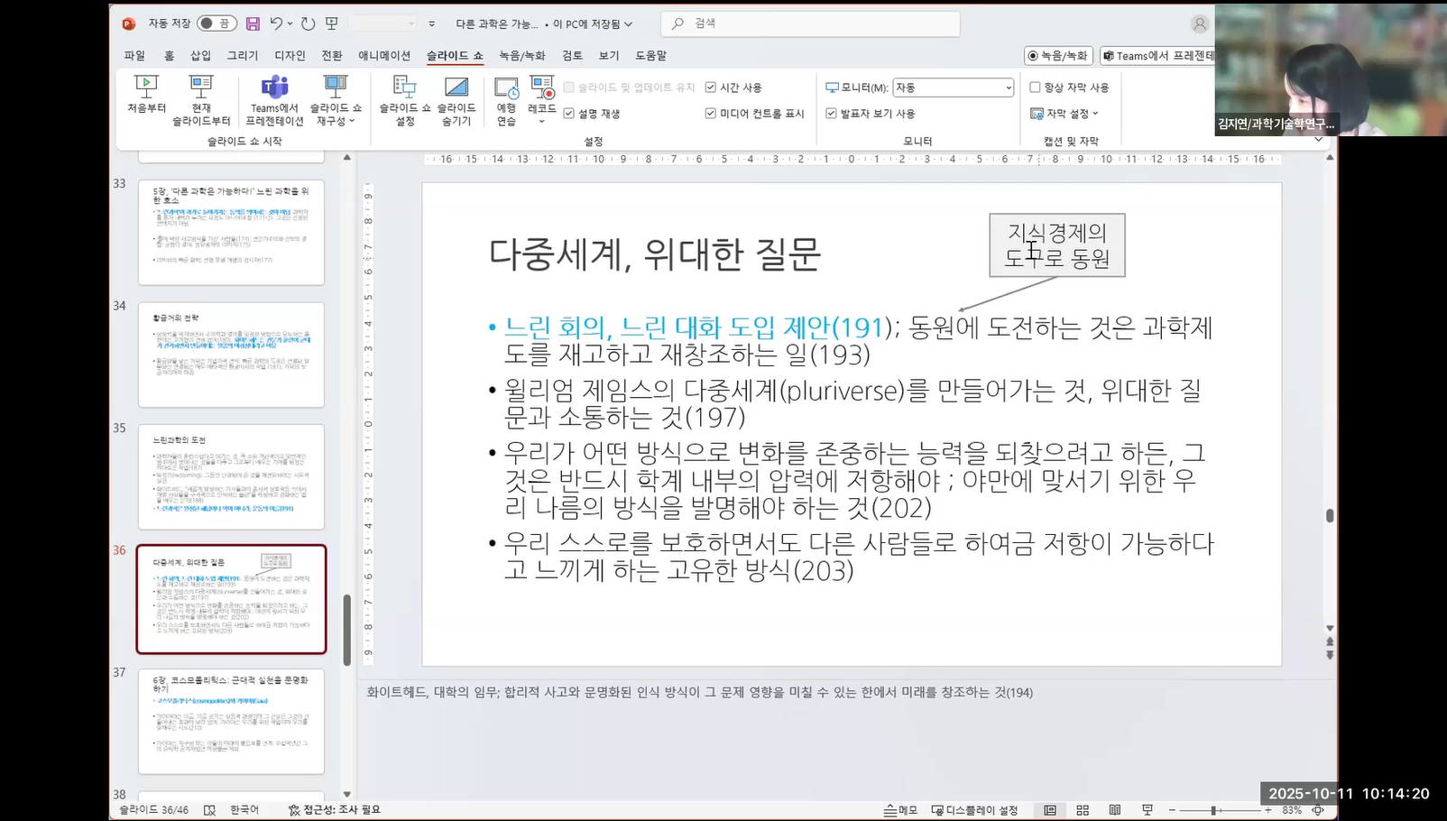 가칭 시민과학학교 준비 2차 세미나에서는 ‘느린 과학’을 주제로 과학과 사회가 어떻게 함께 움직일 수 있을지 이야기했습니다. 과학적 사실이 절대적 진리가 아니라 사회적 맥락 속에서 만들어진다는 점과, 시민이 지식 형성 과정에 직접 참여해야 한다는 점도 강조되었습니다. 과학자는 단순한 지식 전달자를 넘어 시민과 소통하고 협력하는 ‘외교관’ 같은 역할을 해야 하며, 시민학교는 글쓰기, 질문 제출, 토론 등 다양한 참여형 활동을 통해 시민들이 비판적 사고와 정책적 질문 능력을 키울 수 있는 장으로 설계되어야 한다는 의견이 나왔습니다. 시민학교가 함께 배우고 생각을 나누는 민주적 학습의 장으로 자리매김해야 한다는 메시지를 확인할 수 있었습니다. |
