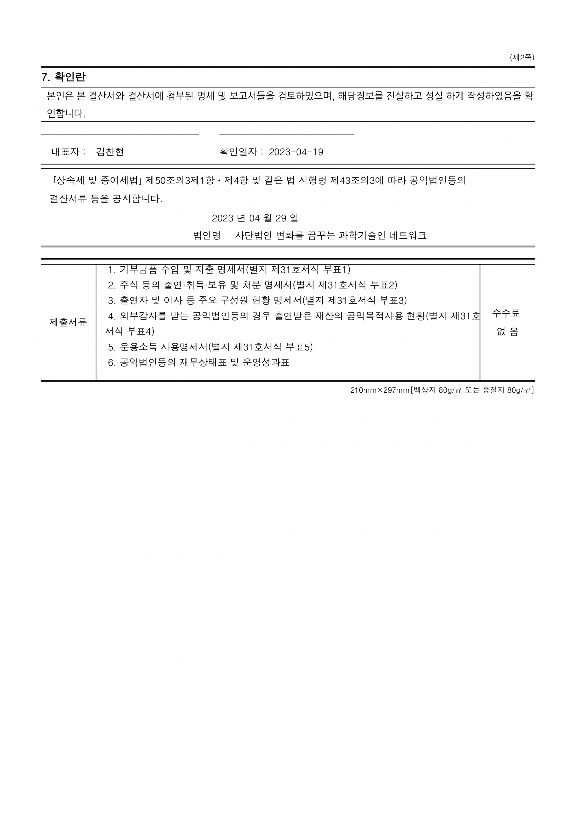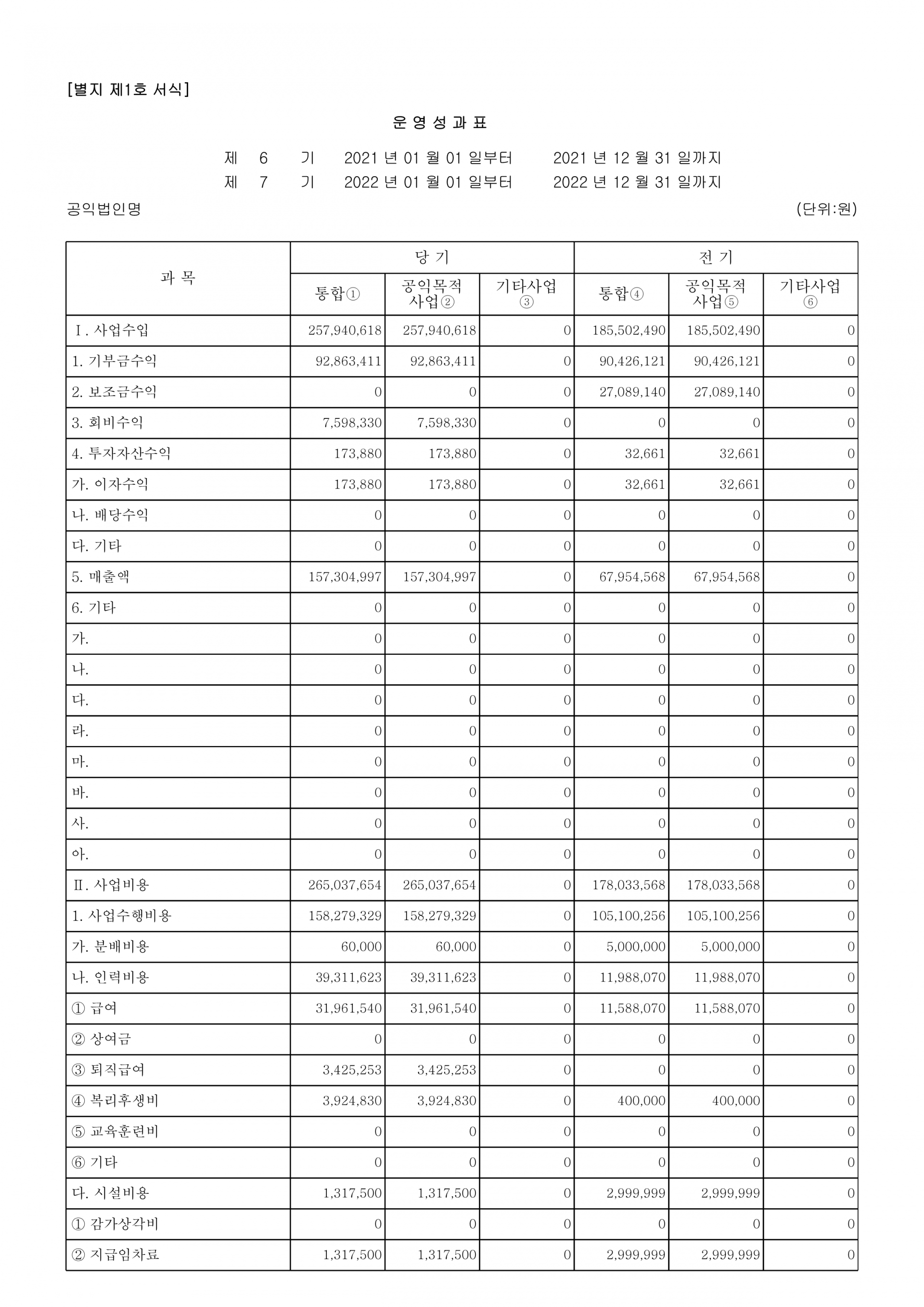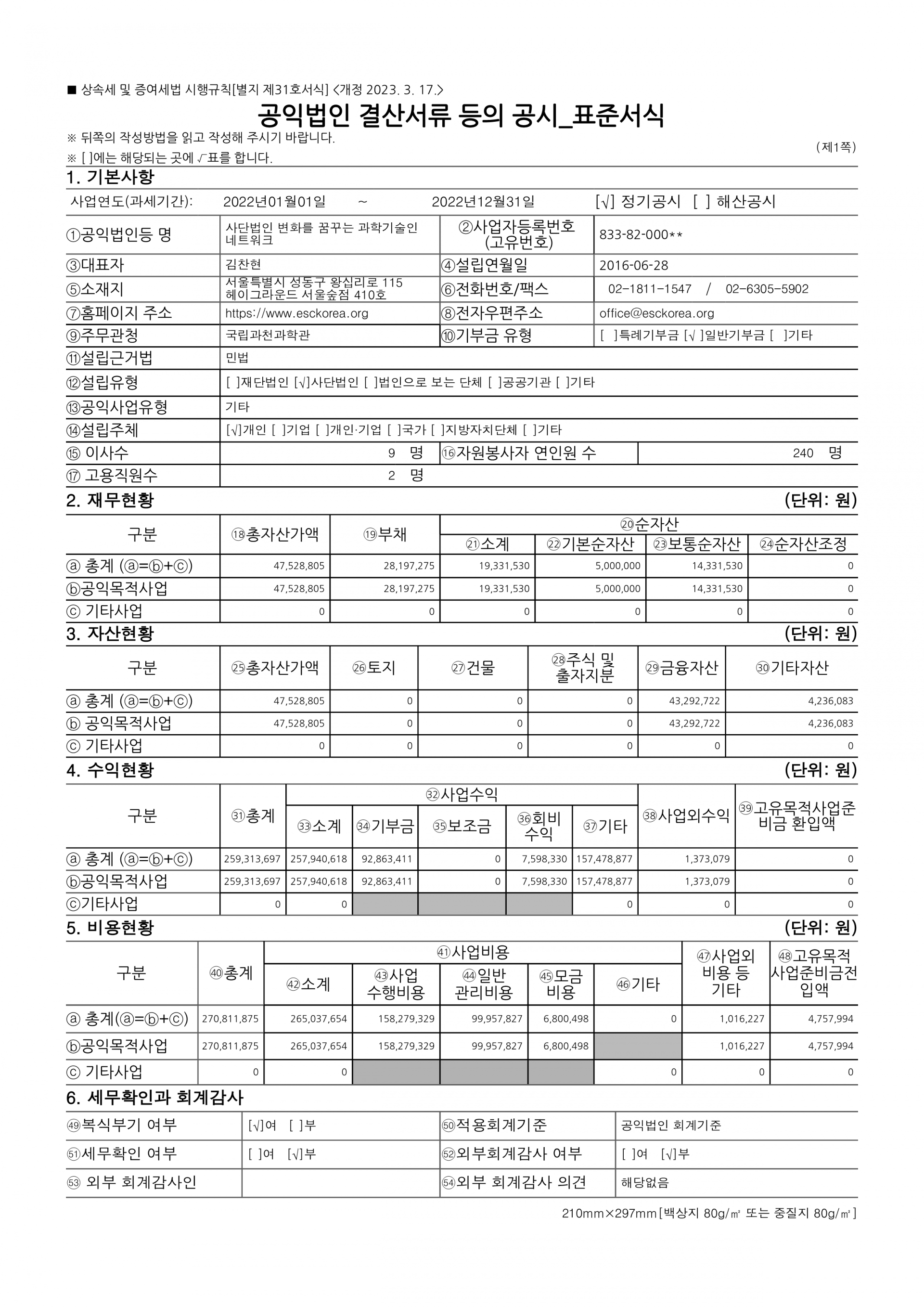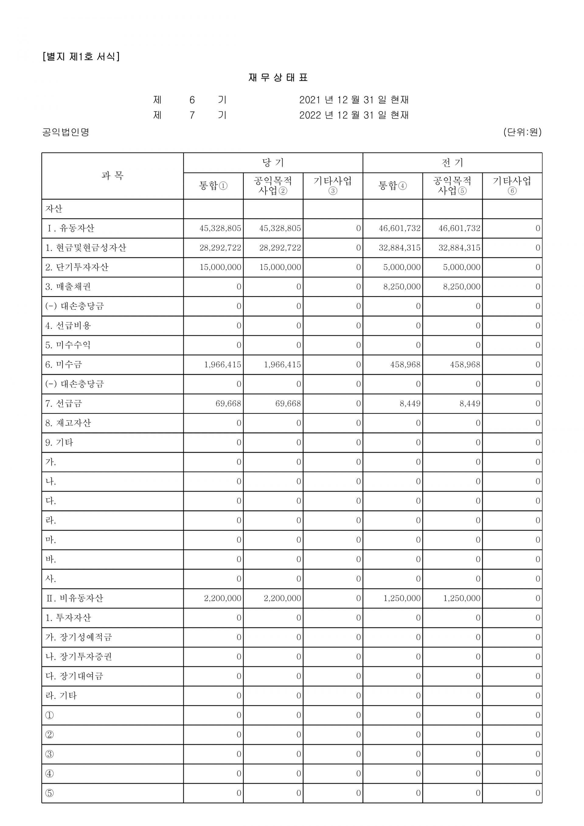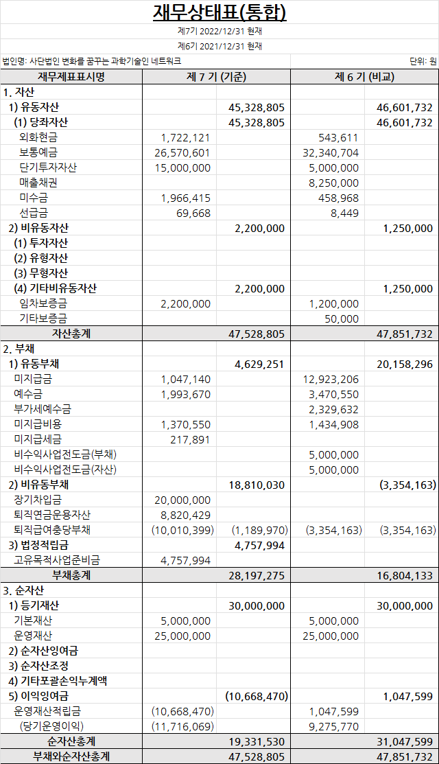 2022년 제7회기 결산 재무제표 및 주석, 기부금품 수지 명세 등 의무사항을 공시합니다.