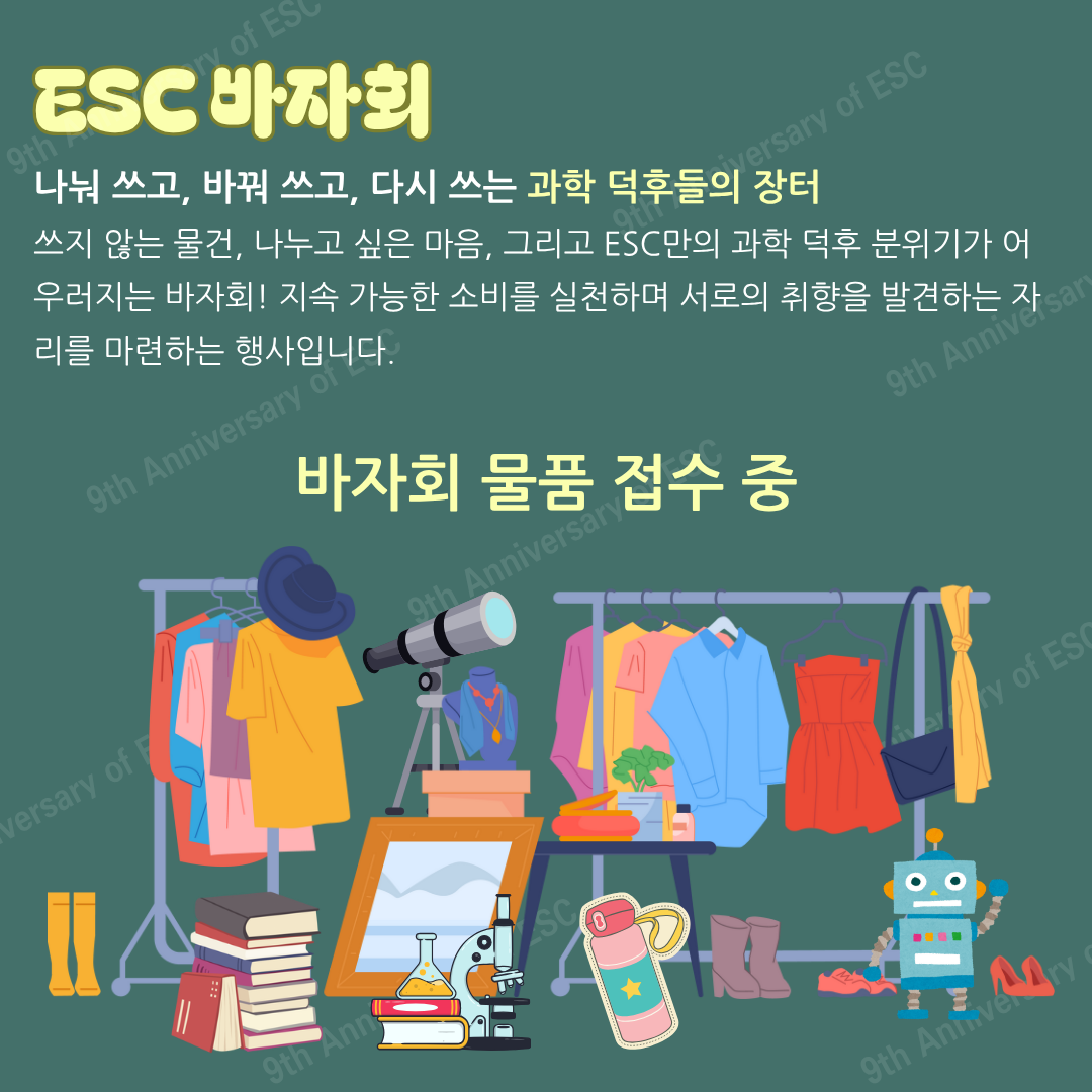 쓰지 않는 물건, 나누고 싶은 마음, 그리고 ESC만의 과학 덕후 분위기가 어우러지는 바자회! 지속 가능한 소비를 실천하며, 서로의 취향을 발견하는 뜻밖의 즐거움의 만남을 경험하세요.