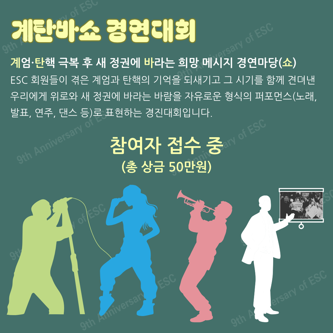 ESC 회원들이 겪은 계엄과 탄핵의 기억을 되새기고 그 시기를 함께 이겨낸 우리의 저력을 되짚어보며, 새 정권에 바라는 메시지를 웃음과 위트가 가득한 퍼포먼스 경연을 통해, 풍자와 연대의 메시지를 함께 나눕니다.