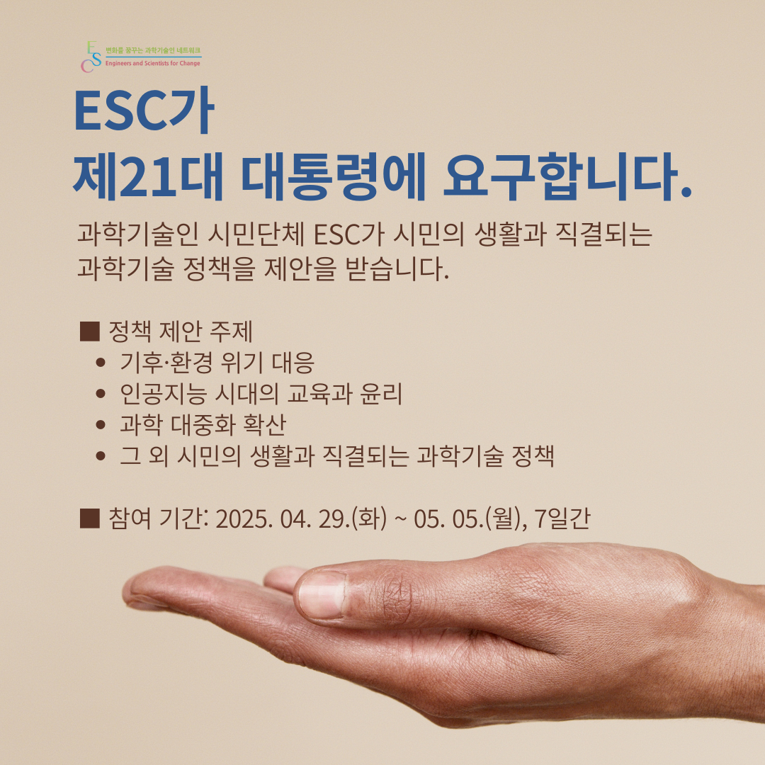 ESC는 이번 대선을 맞아 과학기술 관련 정책 제안을 준비하고 있습니다.