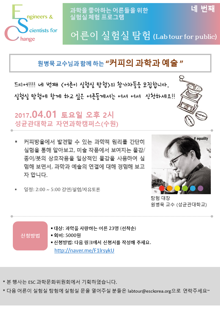 2017년 업그레이드된 어른이 실험실 탐험이 시작됩니다! 많은 분들의 앵콜 요청으로 올 해 첫 어른이 실험실 탐험은 원병묵 교수님과 함께합니다.