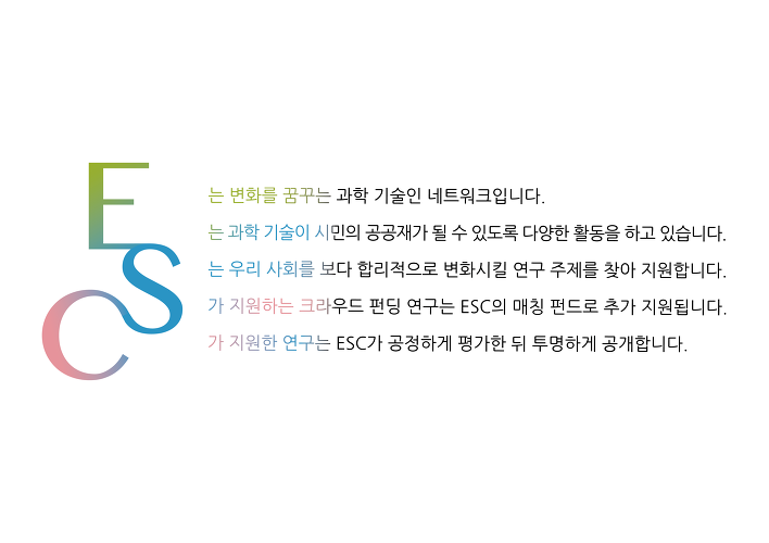 매칭펀드: 펀딩 목표 금액 1000만원 달성 시, 최종적으로 연구에 필요한 금액인 2000만원에서 모금액을 제외한 나머지 금액을 ESC 매칭펀드로 지원합니다. 예를 들어 펀딩 플랫폼에서 1200만원이 모였을 경우, ESC는 800만원을 지원합니다. 펀딩 모금액이 1000만원 미만이거나 2000만원 초과인 경우에는 지원하지 않습니다.
