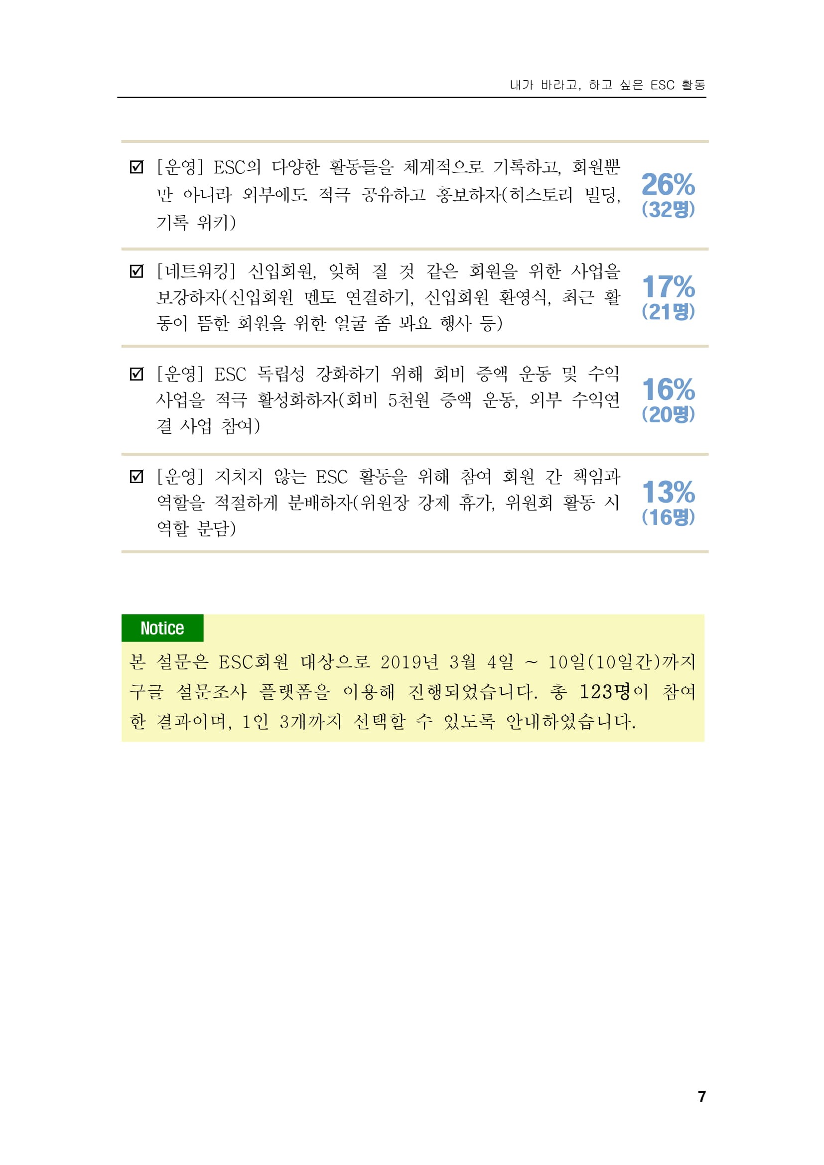 분들이 가장 바라고, 하고 싶은 ESC 활동’으로 설문조사를 통해 선호조사를 완료하였습니다.