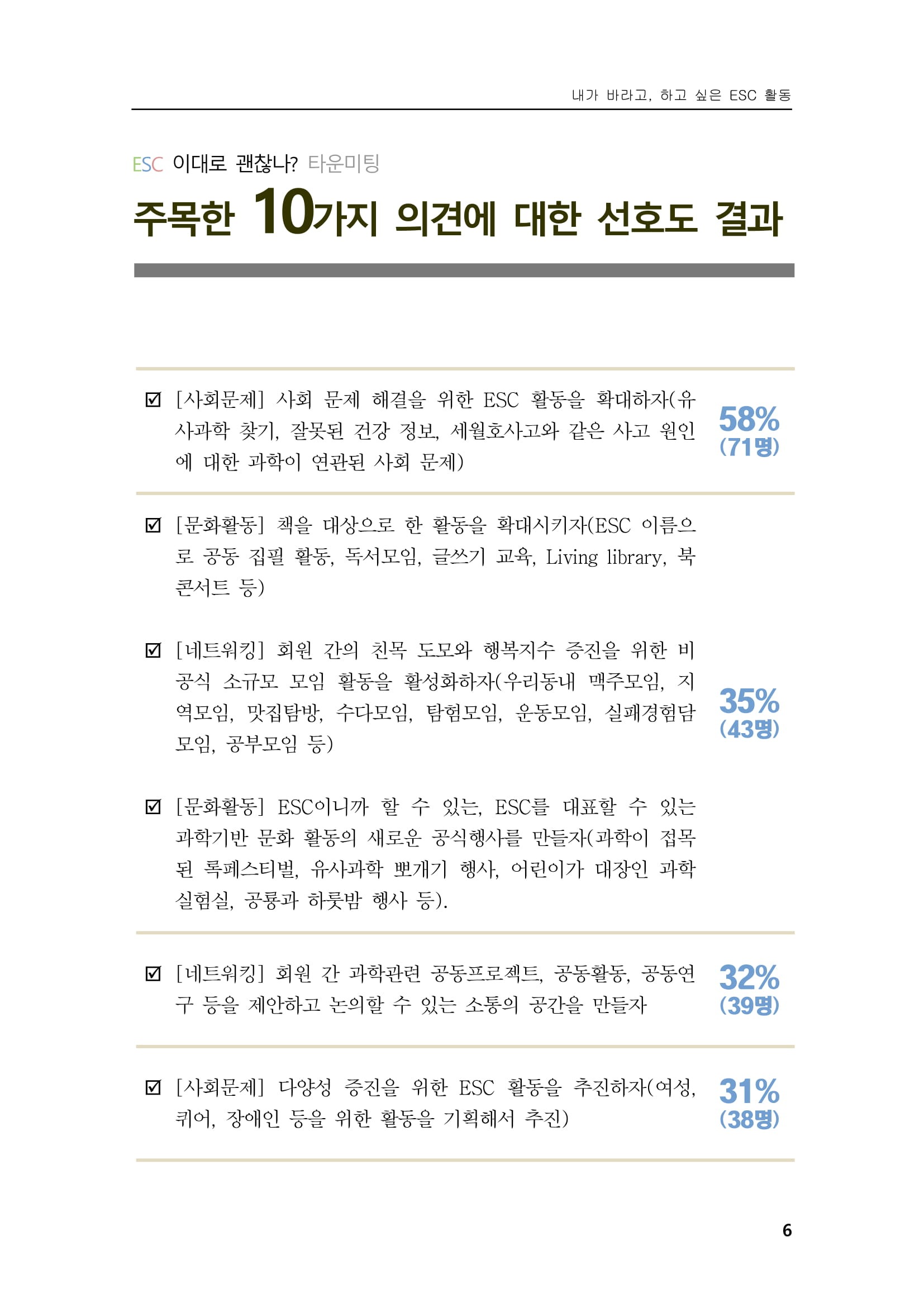 다. 타운미팅에서 특히 많이 언급된 주요 제안 10가지를 선별하였고, 10가지 중에서 ‘ESC 회원