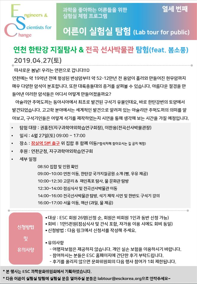* 참여하시는 분들은 ESC 홈페이지에 간단한 후기 부탁드립니다. 후기를 올리지 않는 분에 한해서 다음 문화위원회 행사 1회 참여 제한하도록 하겠습니다.