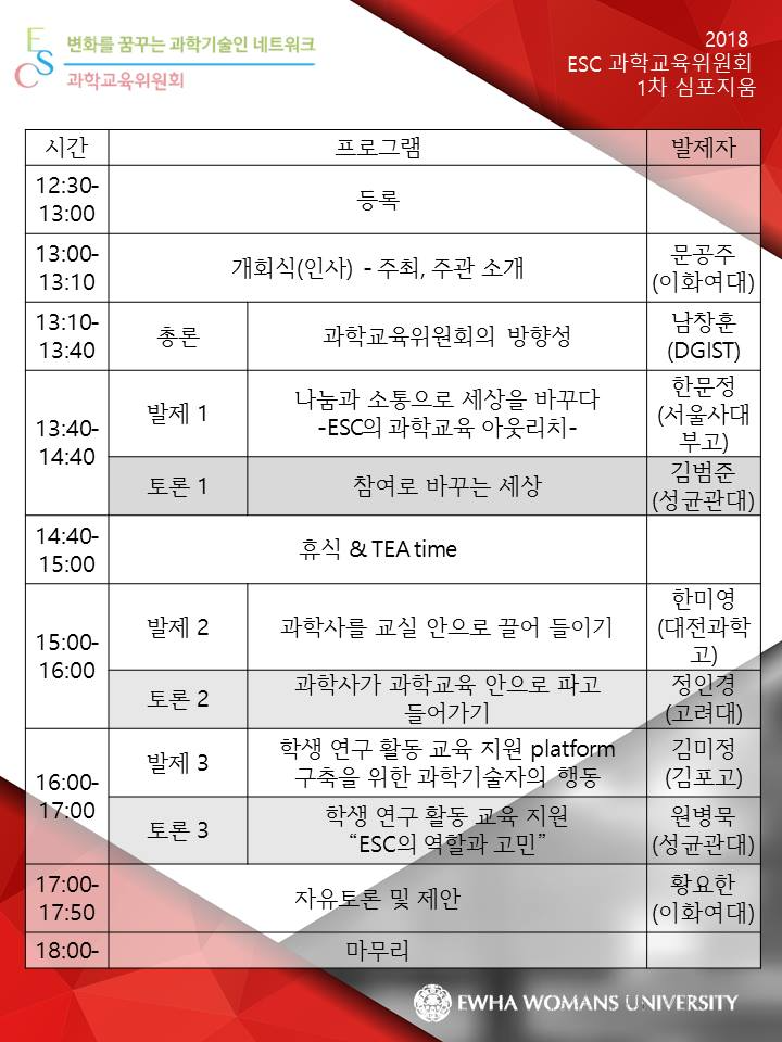 2018년 2월 24일, 이화여자대학교 교육관에서 ESC 과학교육위원회가 1년간 고민한 흔적을 가지고, 처음으로 함께 이야기하고자, 공유하는 자리를 마련하였습니다.
