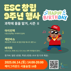 ESC 창립 9주년 행사 - 과학에 몸을 맡겨, 시즌 II 계탄바쇼 ■ 날짜 및 장소 - 날짜: 2025년 6월 14일(토) 14:00~20:00 - 장소: 성수동 헤이그라운드 서울숲점 10층 - 대상: ESC 회원의 가족, 지인도 초대할 수 있어요. - 참가비: 일반 30,000원, 학생 20,000원 (식사와 다과 제공) - 환경 생각하기: 환경을 ...