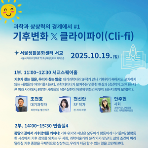 과학과 상상력의 경계에서 #1 기후변화 클라이파이(Cli-fi) 📍 장소: 서울생활문화센터 서교 (서울시 마포구 양화로 72 효성해링턴타워 지하 1층) 📅 일시: 2025년 10월 19일 (일) 📖 1부. 서교스퀘어홀 (11:00~12:30) 기후가 찾는 질문, 우리가 찾는 맑음:대기과학자와 SF작가 만나 기후위기 속에서도 포기하지 않는 사람들의 이야...