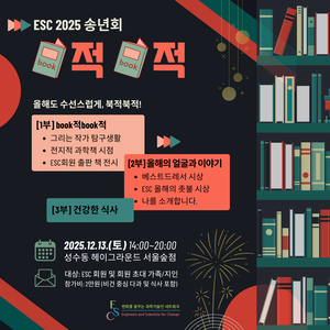 참가신청 올해도 수선스럽게, 북적북적! ESC 회원들이 book적 book적 모여드는 순간을 놓치지 마세요. 연말의 마지막 멋진 추억의 페이지를 ESC와 함께 만들어 보아요. - 일시:2025년 12월 13일(토)14:00~20:00 - 장소: 헤이그라운드 서울숲점 10층 - 대상: ESC 회원 및 회원 초대 비회원(가족/지인) - 참가비: 2만원(저...