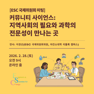 [ESC 국제위원회 미팅]커뮤니티 사이언스: 지역사회의 필요와 과학의 전문성이 만나는 곳 연사: 이경선(ESC 국제위위원, 아칸소대학 리틀록 캠퍼스) 일시: 2026년 2월 28일(토) 오전 9시 Zoom 접속 경로 https://us06web.zoom.us/j/87210077423?pwd=zJNo3e0UBEjTQT0BqVajabrAaneGpm.1 ...