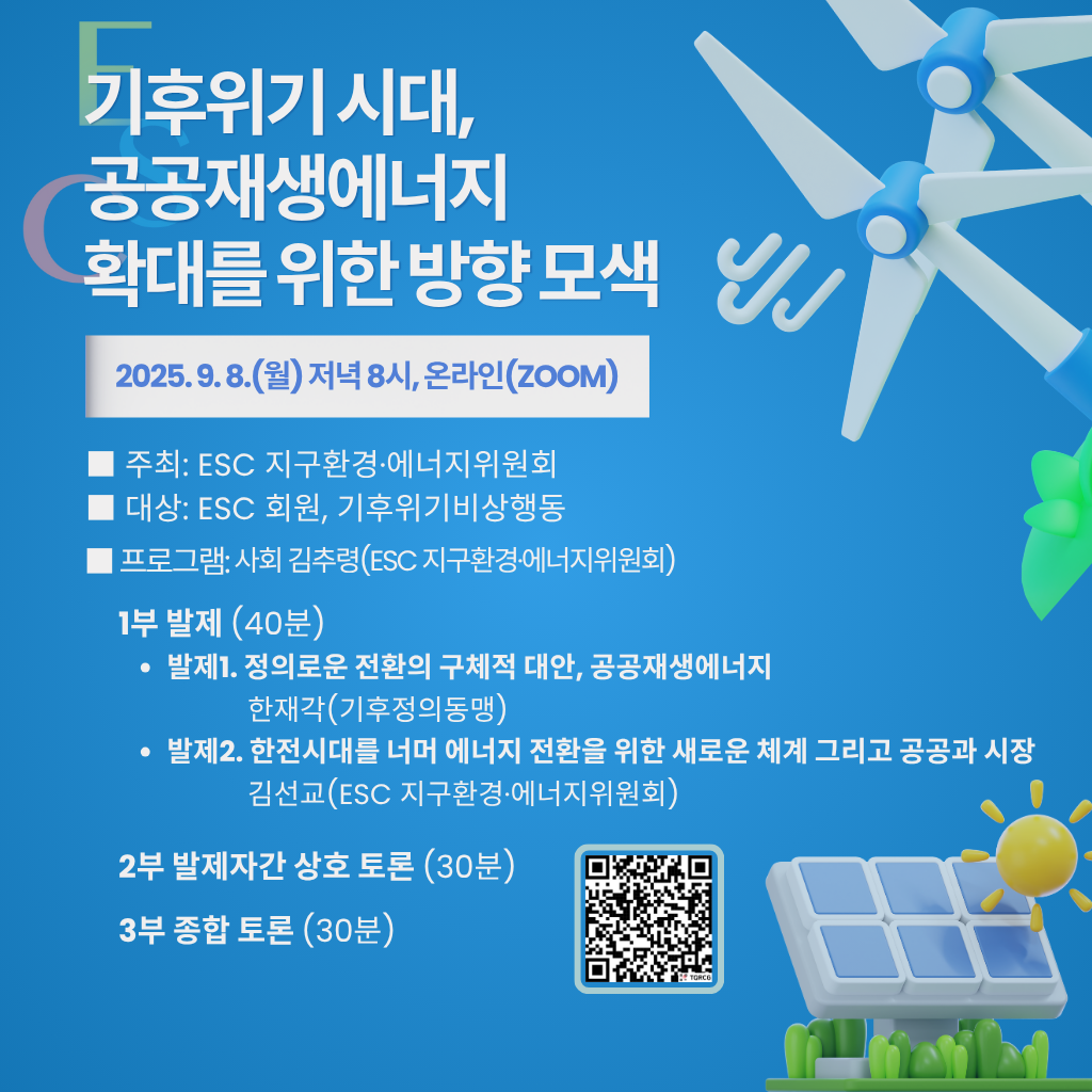 ESC 내부 세미나에서 논의되었던 한전 독점구조 철폐 및 전력산업구조 개편 방향과, 기후정의동맹이 추진 중인 공공재생에너지 입법 사이의 공통점과 차이점을 확인하고, 상호 이해를 바탕으로 향후 협력의 방향을 모색합니다.