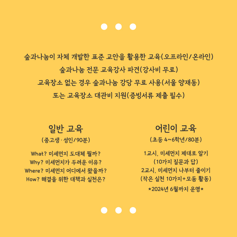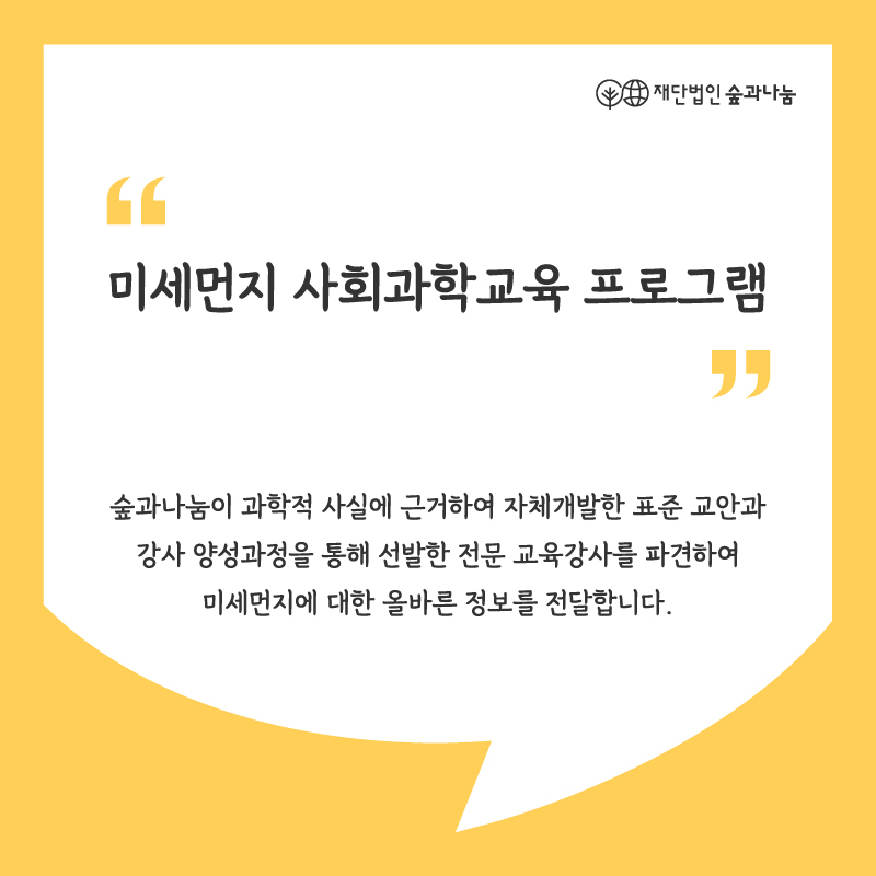 숲과나눔이 선발한 전문 교육강사를 파견하여 미세먼지에 대한 올바른 정보를 전달합니다