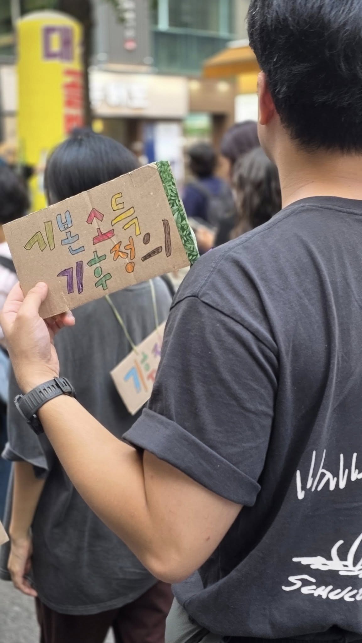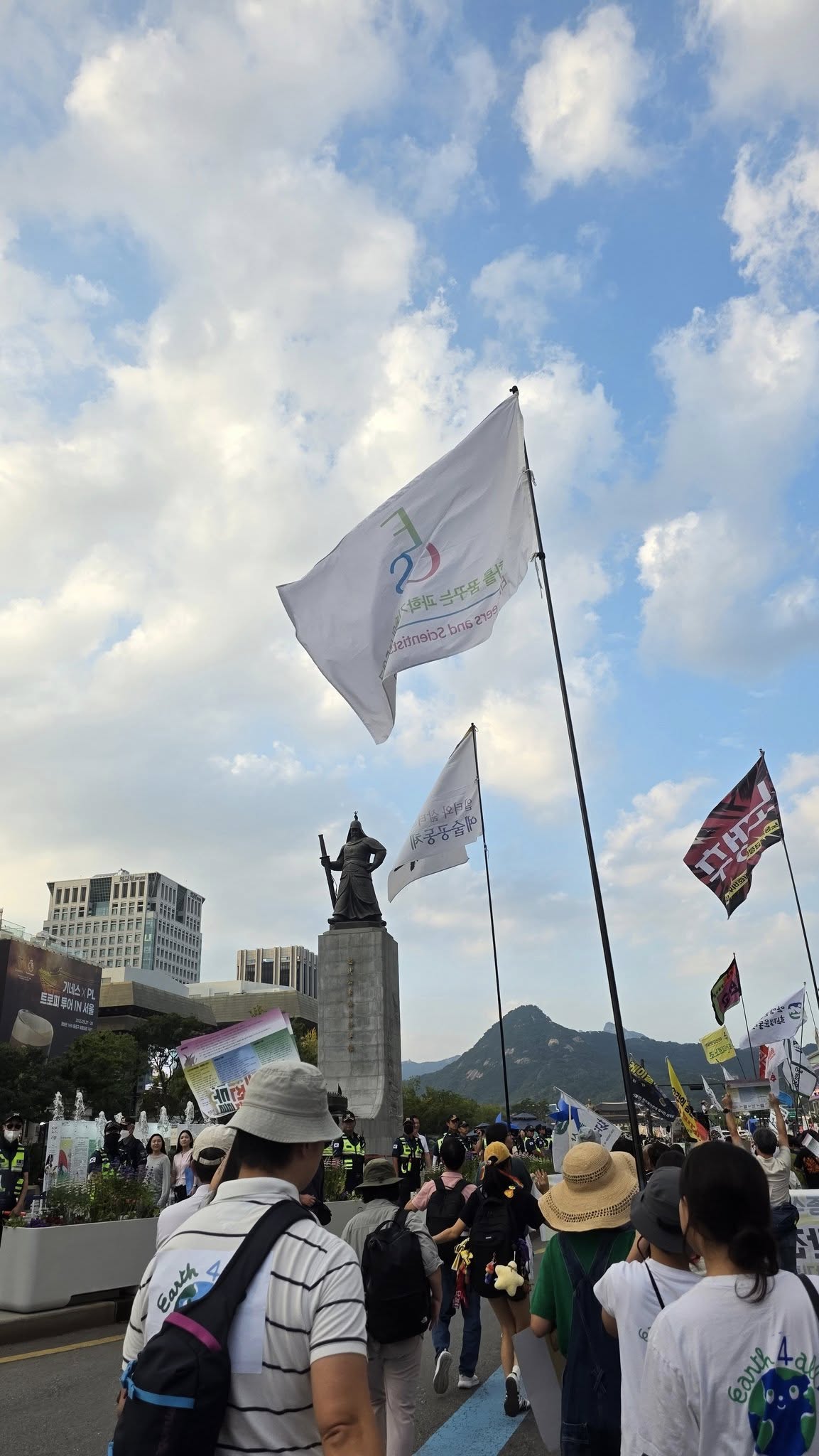 함께 행진한 김미정님과 지난해 강남에서 기후정의행진이 열렸을 때는 섭섭했다고 말했다. 강남은 광화문과는 걷는 맛이 다르다. 세 시간 돌아 세종대왕님과 광화문을 만나야 비로소 뿌듯한 기분이 든다. 이 맛에 기후정의행진에는 매년 오게 된다. 당신도 한 번 와봤으면 좋겠다. 나는 여전히 일회용품을 자주 쓴다. 정의로운 사람이 못되고 정의를 지지하는 사람이다. 오늘은 나처럼 나약한 우리가 모이는 날이다. 나약한 우리도 함께한다면 강해질 테니까.