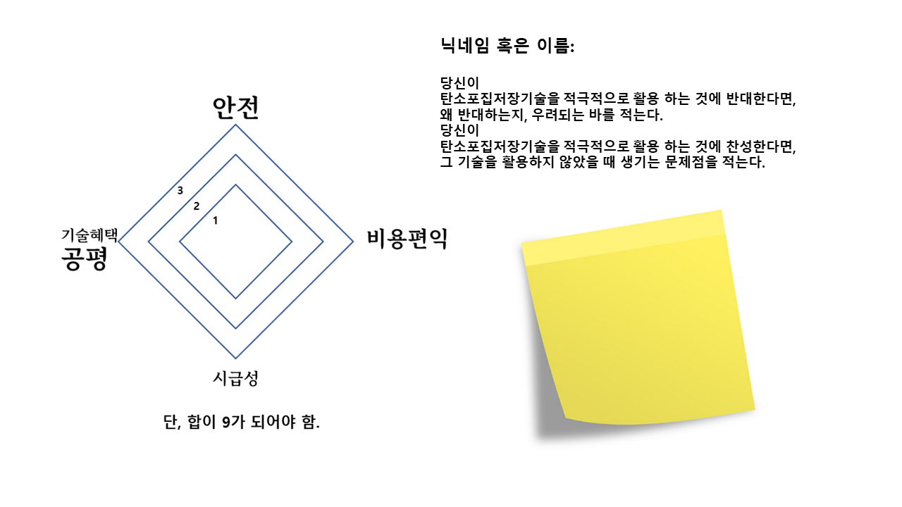 다음으론‘기후변화를 막기 위한 과학기술의 활용’에 관한 토론으로 이어졌습니다. 공기 속 탄소를 포집하는 ‘이산화탄소 포집·제거 기술’, 성층권에 에어로졸을 분사해 태양 빛을 차단하는 ‘태양복사에너지 조절 기술’처럼 기후 변화를 막기 위한 기술 개발이 진행 중인데요, 이러한 과학기술 활용 시 유의해야할 4개 요소, 안전성, 기술혜택의 공평성, 비용편익, 문제해결의 시급성에 대해 그 중요도를 따져보았습니다. 레이더 차트를 이용해 각자의 의견을 발표하고 과학기술활용 -탄소포집기술을 중심으로-에 대한 찬반 입장도 정리해보았습니다.
