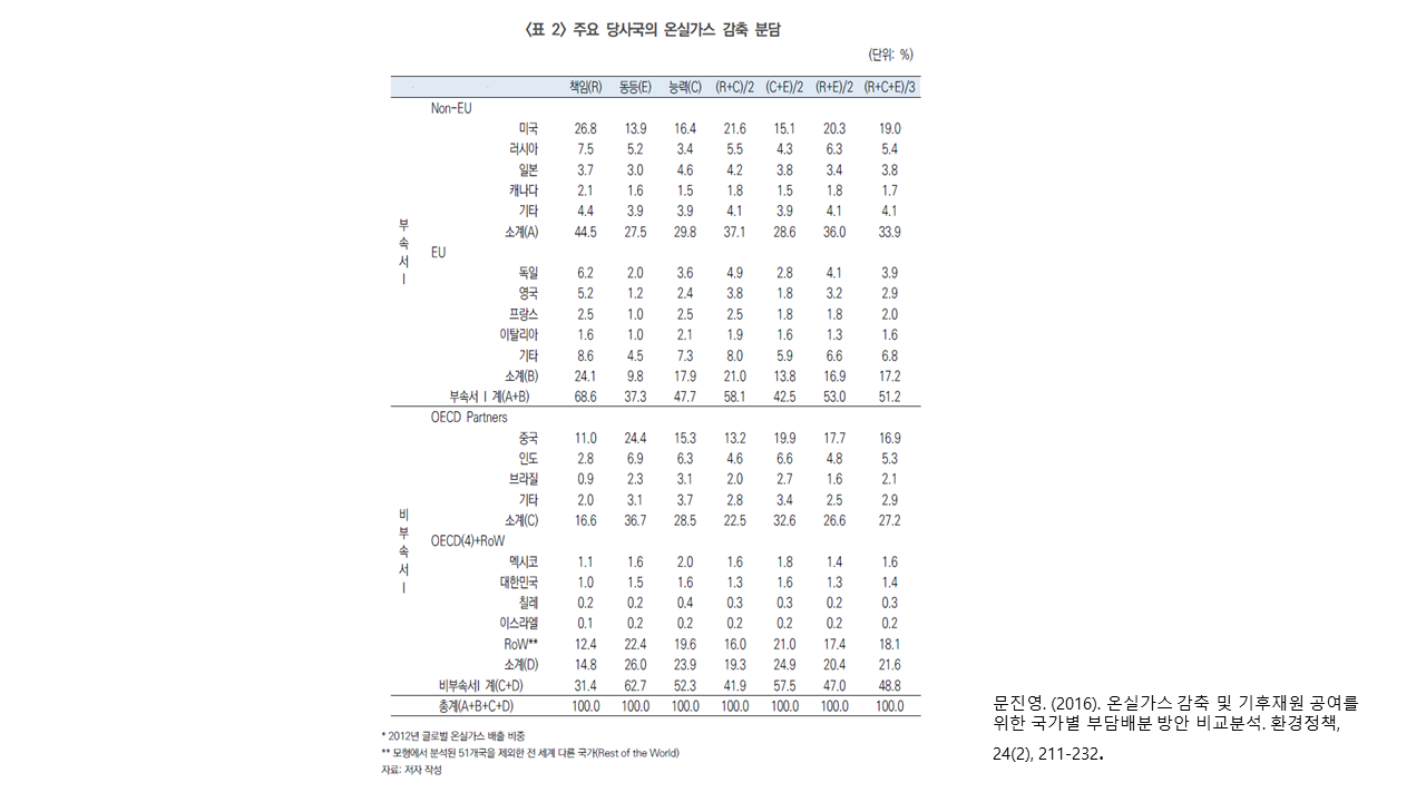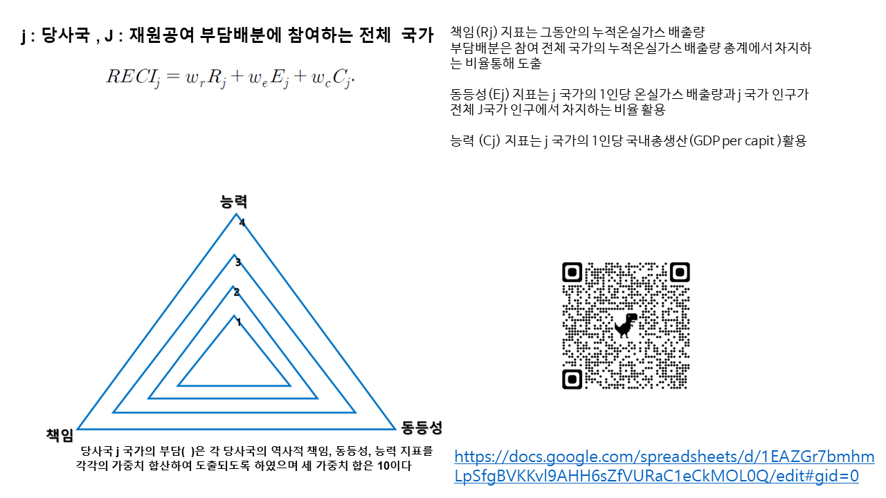 먼저 추령님께서 ‘손실과 피해 기금’의 제안 배경, 지난 30년간의 논의 경과, 기후변화협약에서 언급된 원칙과 논쟁 등에 대해 설명해주셨습니다. 이어 기후변화 대응을 위한 국가 간 부담 배분 모형에서 사용하는 RECI(Responsibility-Equality-Capability Indicator) 지표를 가지고 각자 기후정의에 부합하는 모델을 설계해보고 그에 대한 생각을 나누었습니다. 기후변화의 책임을 공정하게 지우기 위한 기준으로 역사적 책임(온실가스 누적배출량), 온실가스 감축 분담 능력, 모든 당사국의 동등한 책임 등이 적절한지, 어떤 비중과 가중치로 적용할지, 그 외 또 다른 고려기준은 없는지 등에 대해 다양한 의견들이 쏟아졌습니다.