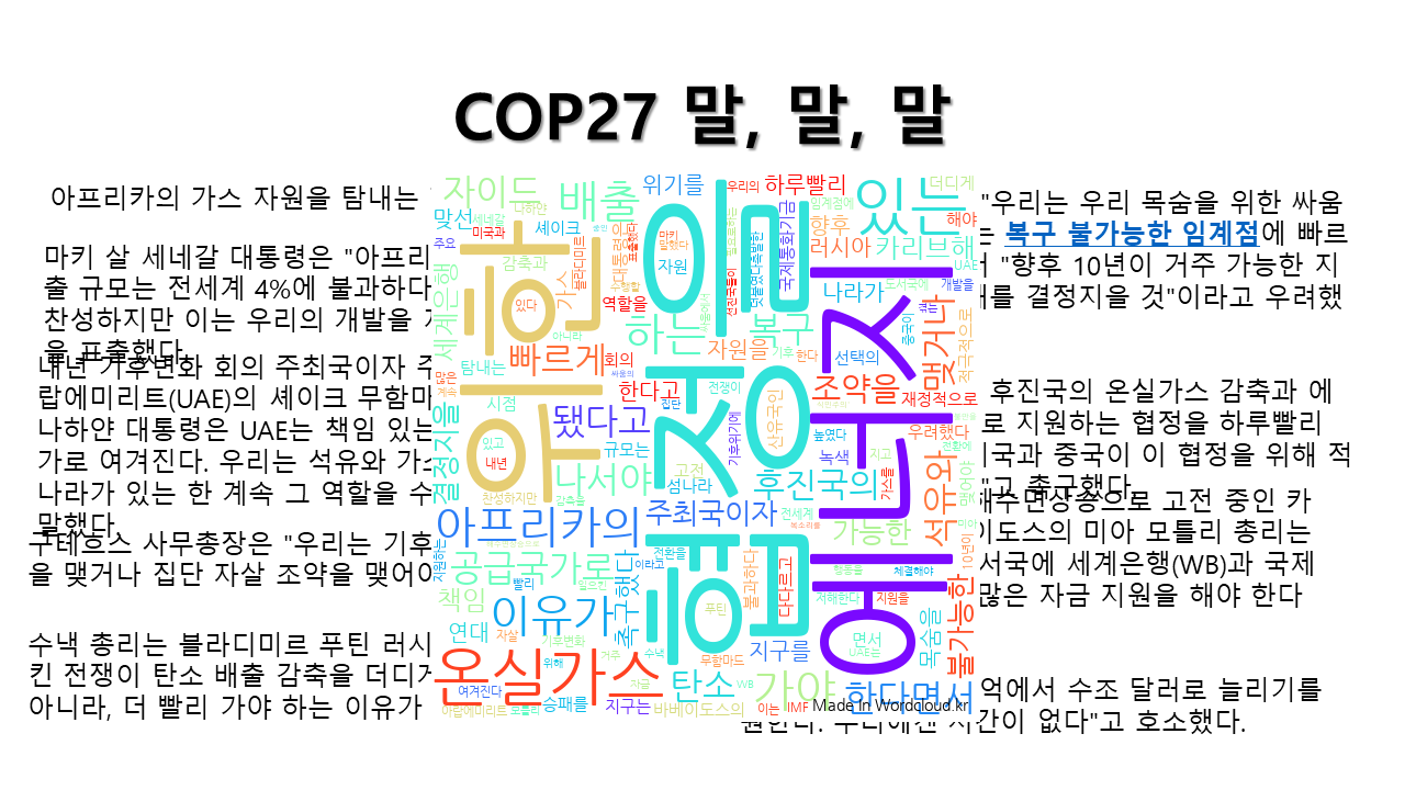 지난 11월 이집트 샤름 엘 셰이크에서 열린 제27차 유엔기후변화협약 당사국총회(COP27)에서는 기후변화에 따른 개발도상국의 손실과 피해 보상을 위한 기금 조성에 대한 합의가 이루어졌는데요, 그간 기후변화에 대한 책임을 회피하던 선진국들이 기금 마련에 합의했다는 점에서 뜻 깊은 일이었습니다. 그러나 앞으로 이어질 구체적인 보상 대상과 범위, 재원 조달·기금 운영 방식에 대해선 격론이 예상되는 만큼 첫 번째 토론 주제는 이와 관련하여‘손실과 피해 보상에 있어 어느 국가가 얼마나 부담해야 하는가’에 대한 생각을 나누었습니다.